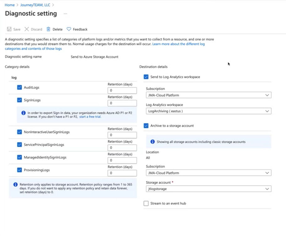 - Then send to the right Azure subscription to the Log Archiving Workspace. You can also send them to a storage account.