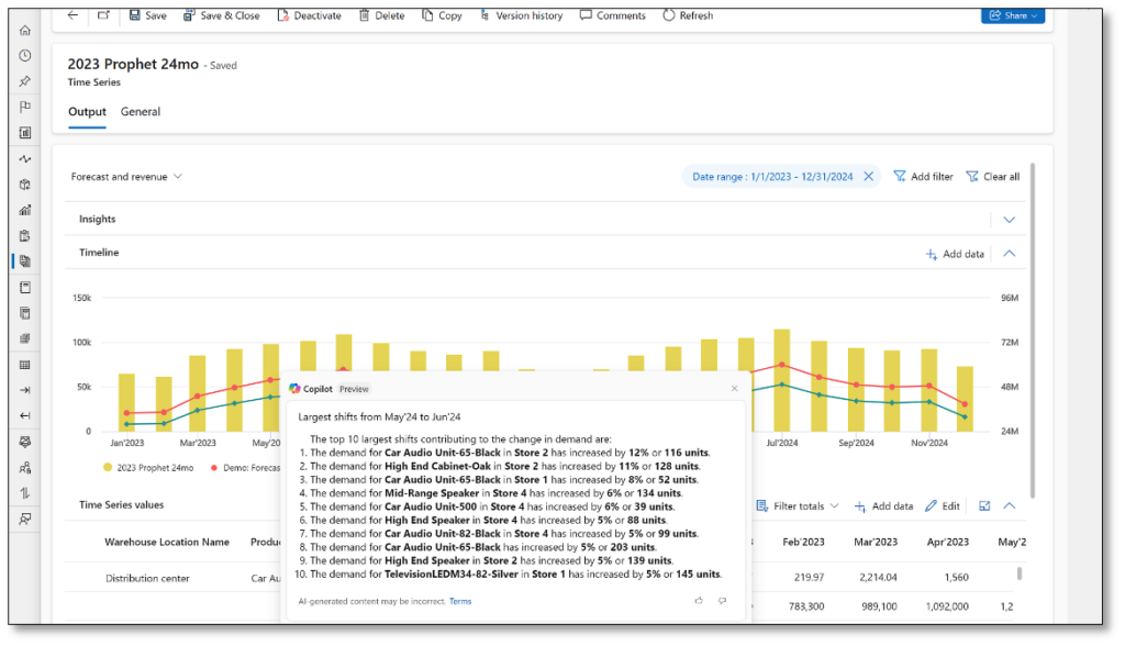 Planners can query the system by asking questions like “Why is this variance occurring?” or “What is causing this shipping delay?” and Copilot will respond. This in-context advice helps planners make more informed decisions and improve forecast accuracy.