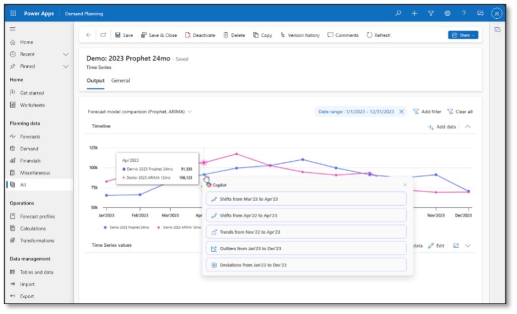 For example, let’s say a demand planner is interested in learning the most significant factors that contributed to a notable shift between two consecutive periods. The planner opens the relevant worksheet, selects a point of interest on the chart, and then selects a predefined question to ask Copilot. The app then provides answers in real time.